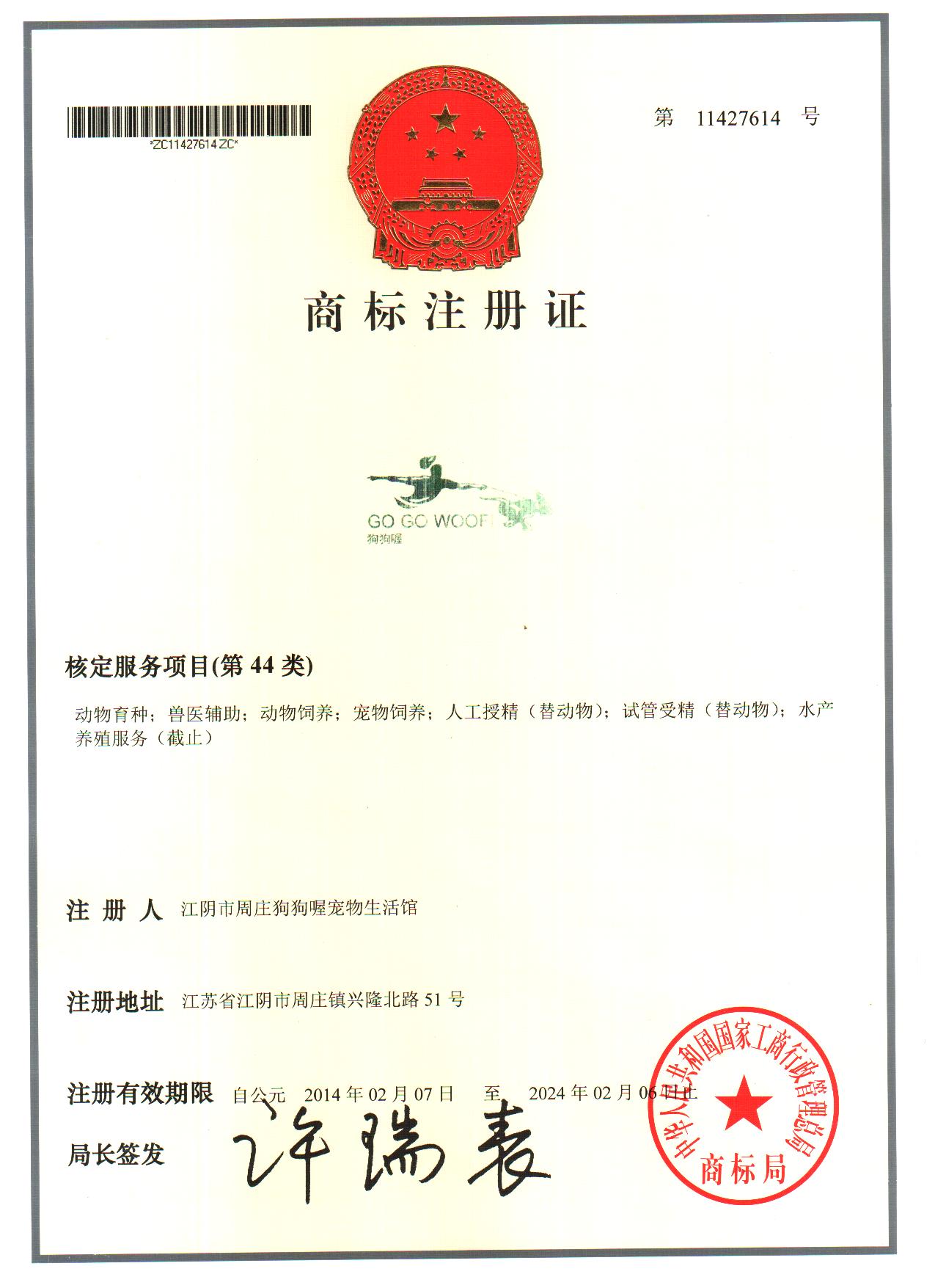 狗狗喔商标注册证