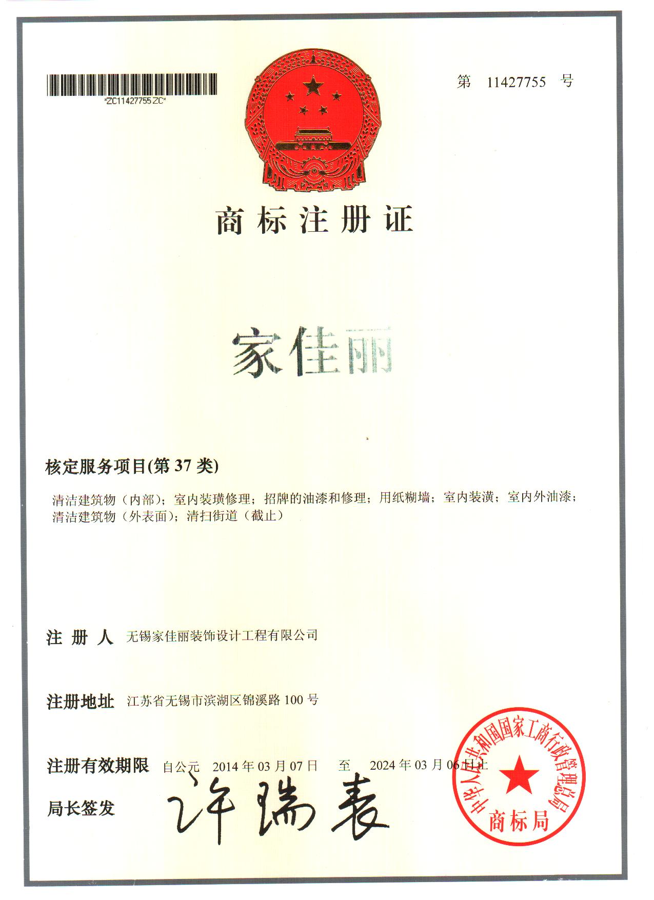 家佳丽商标注册证